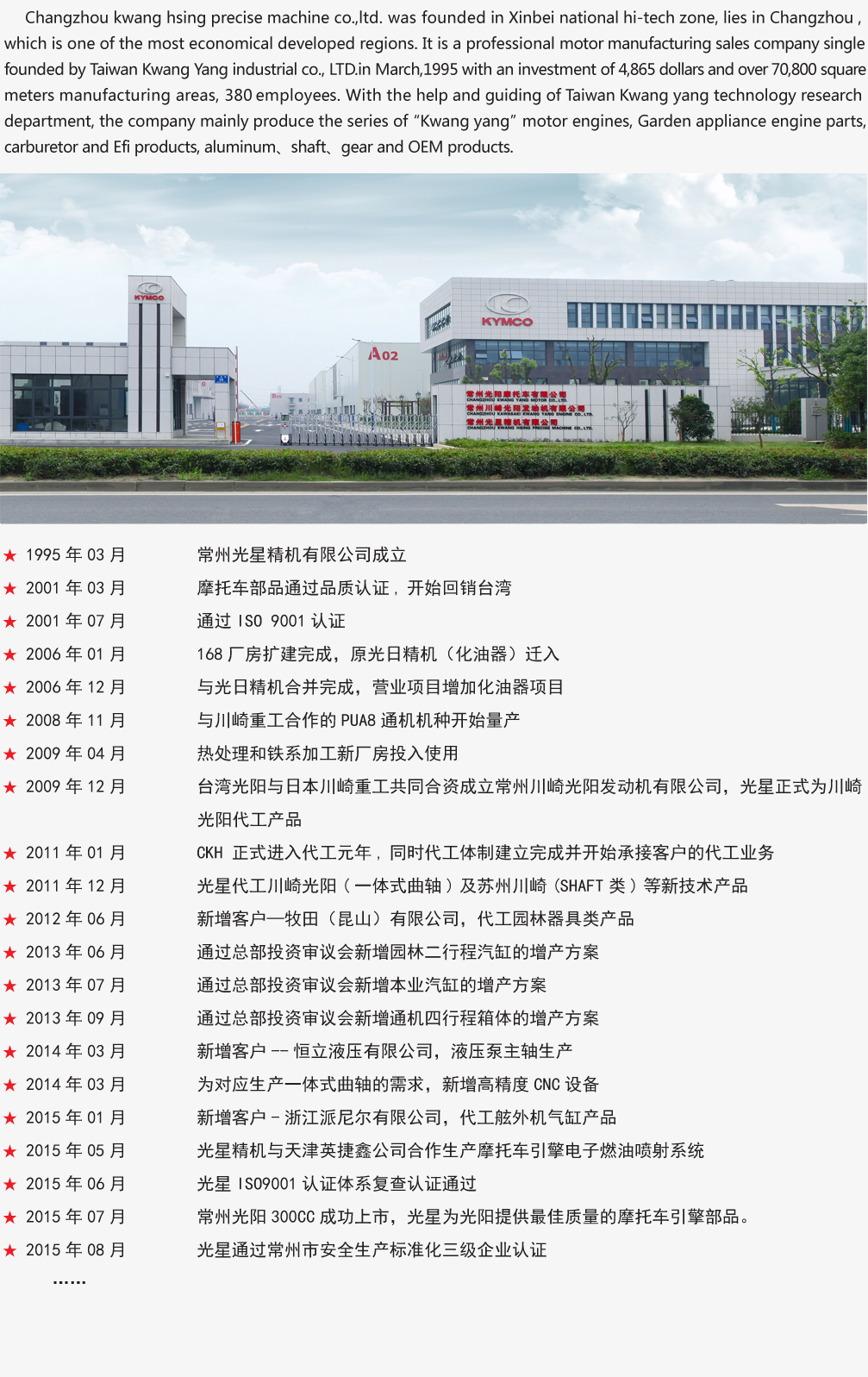 常州光星精機有限公司,地處長三角經(jīng)濟最發(fā)達地區(qū)之一的常州市,公司建于新北國家高新區(qū)內(nèi),由臺灣光陽工業(yè)股份有限公司1995年3月獨資設(shè)立的專業(yè)發(fā)動機制造銷售公司,投資總額4865萬美元,占地總面積7.08萬平方米,現(xiàn)有員工380人。依托臺灣光陽技研部與生產(chǎn)中心的支援與指導(dǎo),公司主要生產(chǎn)“光陽”摩托車系列發(fā)動機,園林器具發(fā)動機零部件,化油器及電噴產(chǎn)品,鋁、軸、齒輪類代工產(chǎn)品。