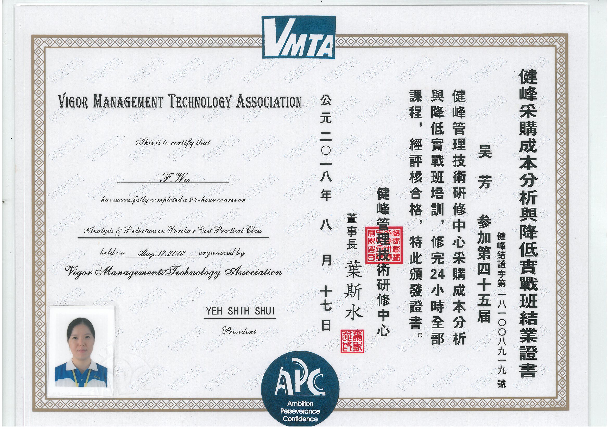 為開(kāi)拓公司管理層視野,提升(基)中層人員專業(yè)素養(yǎng),我司特與健峰管理技術(shù)研修中心合作—量身定制適合每一位管理干部的專業(yè)課程?,F(xiàn)已完成培訓(xùn)結(jié)業(yè)的課程有:目視化管理實(shí)務(wù)、采購(gòu)成本分析與降低實(shí)戰(zhàn)、車間管理七大實(shí)務(wù)、以及物料與倉(cāng)儲(chǔ)管理實(shí)務(wù)。